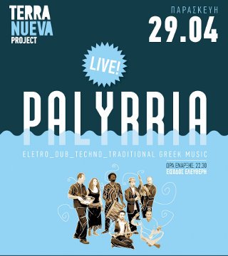 Στις 29 Απριλίου, το συναυλιακό χώρο ΤΡΑΙΝΟ στο Level 3 του πολυχώρου Terra Petra θα καταλάβει με τις μοναδικές κι ασύγκριτες μουσικές του ένα από τα πιο ενδιαφέροντα και σπουδαία συγκροτήματα των τελευταίων ετών της χώρας μας. Η πολυσυλλεκτική ελληνική μπάντα PALYRRIA, που γεφυρώνει το χάσμα ανάμεσα στην παραδοσιακή μουσική και τις σύγχρονες μουσικές της δύσης (electro, dub, techno, κτλ) έρχεται να πλημμυρίσει τις καρδιές μας με τους αρχαϊκούς και ταυτόχρονα φουτουριστικούς ρυθμούς της.Παρασκευή 29 Απριλίου