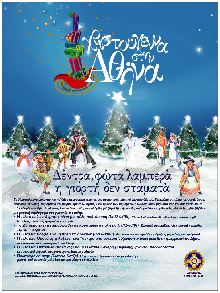Η Αθήνα και αυτή τη χρονιά θα μετατραπεί σε μια απέραντη γιορτή! Ένα Χριστουγεννιάτικο παραμύθι –από τους ήρωες των Χριστουγέννων και τα γιορτινά θέατρα δρόμου - ξετυλίγεται από τις κεντρικές πλατείες: